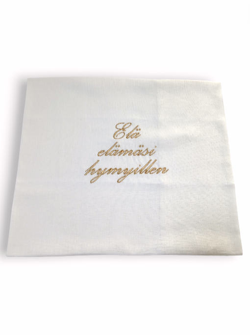 100 % pellava. Koko 50 x 60 cm. Brodeeraus, kestää pesun ja silityksen.