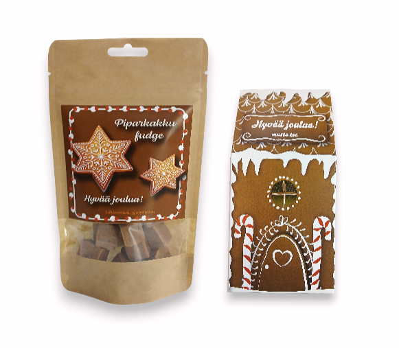 Piparkakku fudge: (L, G) sokeri, tärkkelyssiirappi, pomada, vesi, kookosrasva, maitojauhe, voi, kosteudensäilyttäjä(kasviglyseroli), piparkakkumauste (kaneli, neilikka, inkivääri, pomeranssinkuori), lesitiini(soija), lesitiini, suola, aromi.