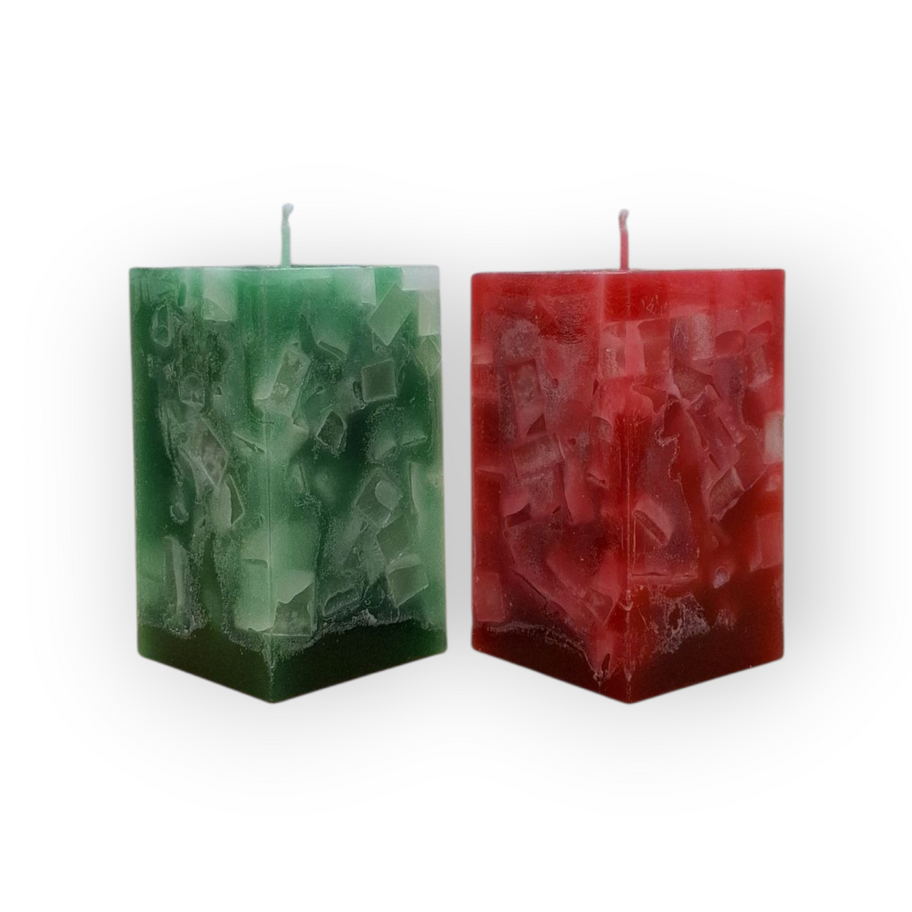 Mosaiikki-kynttilä saatavana tumman punaisena ja vihreänä. Vaikka kynttilä on läpivärjätty, valo siivilöityy paloista läpi ja tekee kynttilästä hohtavan. Kokeile yksittäin tai muutaman kynttilän rykelmissä!