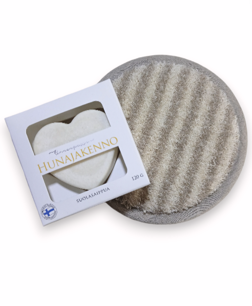 Pellava-froteinen kasvopesin ja hunajakenno suolasaippua.